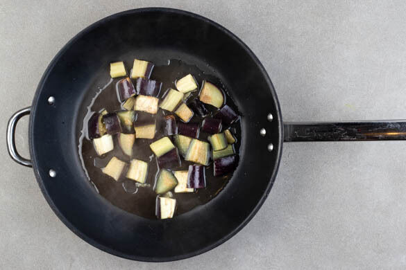 Die Auberginen in ca. 2cm große Würfel schneiden und in einer großen Pfanne mit 300ml Wasser und ½TL Salz bei mittlerer bis starker Hitze abgedeckt in 8–10Min. weich garen. Tipp: Das Wasser in der Pfanne muss nicht komplett verdampft sein.