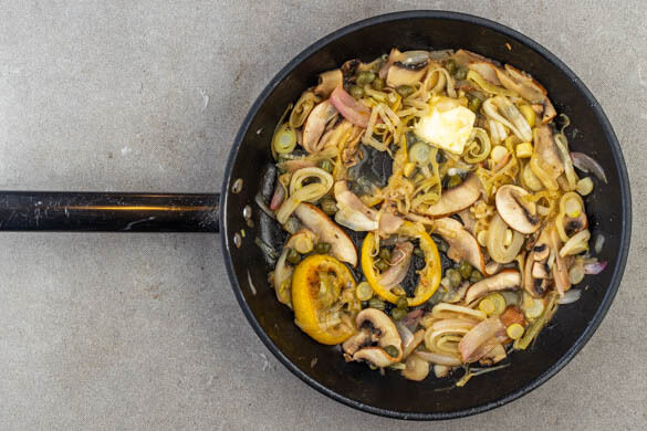 4EL Butter in einer großen Pfanne schmelzen, dann die Schalotten, den Lauch, die Pilze und die Zitronenscheiben zugeben und unter gelegentlichem Rühren 4–6Min. braten, bis das Gemüse weich ist und die Zitrone zu karamellisieren beginnt. Das Brühgewürz und 200ml Wasser unterrühren und 3–5Min. köcheln lassen, bis die Brühe__ um die Hälfte reduziert ist.