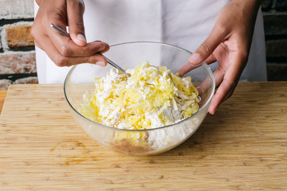 Die Kartoffeln und die Zwiebeln mit 2–3EL Mehl, 1TL Salz sowie 1 Prise Pfeffer und Muskatnuss nach Geschmack vermengen.