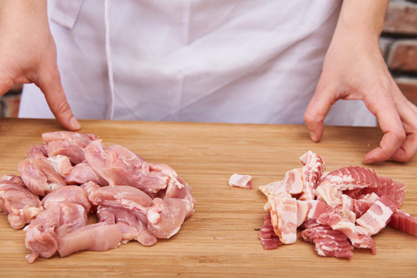 Das Fleisch mit etwas Küchenkrepp trocken tupfen und in ca. 1cm breite Streifen schneiden. Den Bacon ebenfalls in ca. 1cm breite Streifen schneiden.