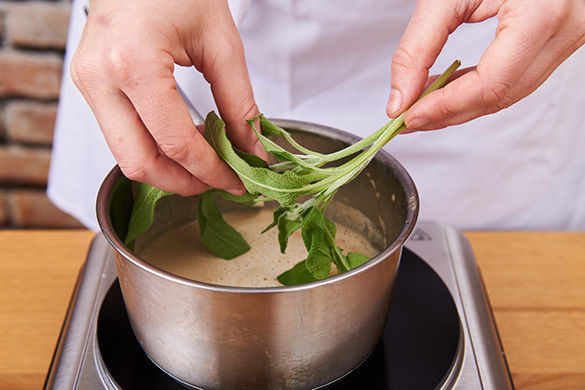 Ca. 2/3 der Schlagsahne, die Sojasauce und 1–2EL Essig in einem kleinen Topf auf mittlerer Stufe erwärmen. Die Salbeiblätter von den Stängeln zupfen, ca. 2/3 der Blätter fein schneiden und in die Sauce geben. Tipp: Wer mag, kann die Blätter auch nur klein zupfen, statt sie zu schneiden. Alles einmal aufkochen lassen und dann bei niedriger Hitze 10–12Min. sanft köcheln.