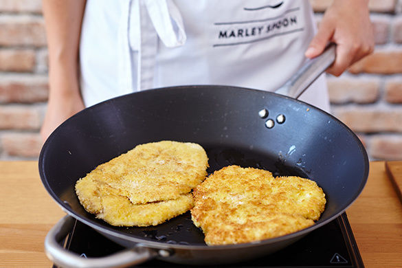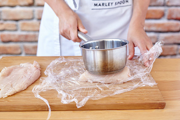 Das Fleischmit etwas Küchenkrepp trocken tupfen und zwischen 2 Lagen Klarsichtfolie z. B. mit dem Boden einer schweren Pfanne ca. 1cm dünn ausklopfen. Anschließend nacheinander im Mehl wälzen, überschüssiges Mehl abklopfen, durch das Ei ziehen und zuletzt in den Semmelbröseln wenden und leicht andrücken.
