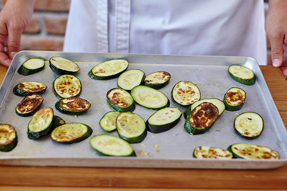 Die Zucchinischeiben mit 1EL Olivenöl sowie Salz und Pfeffer vermengen, auf einem Backblech verteilen und im Ofen 8–10Min. grillen. Nach der Hälfte der Zeit einmal wenden.