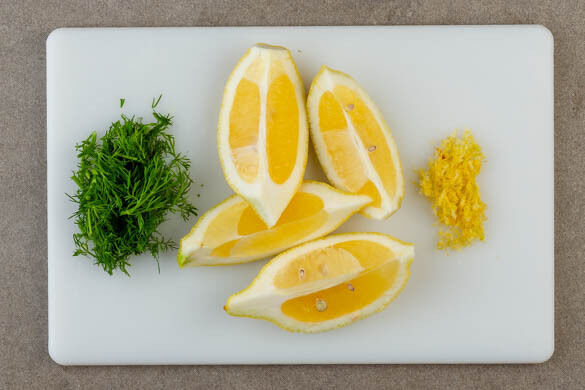 Nebenher die Zitronenschale fein abreiben, dann die Zitronen in Spalten schneiden. Einige kleine Dillstängel beiseitelegen, den restlichen Dill fein schneiden.