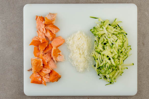 Die Zucchini mit einer Küchenreibe grob raspeln, leicht salzen und mit den Händen oder in einem sauberen Küchentuch gut auswringen. Den Käse fein reiben. Die Haut entfernen und den Lachs mit einer Gabel grob zerteilen, evtl. vorhandene Gräten mit einer Pinzette entfernen.