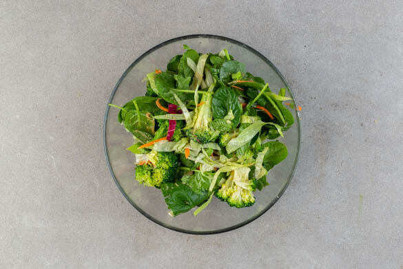 Die Salatmischung, den Spinat und den Brokkoli gründlich mit dem Dressing vermengen.