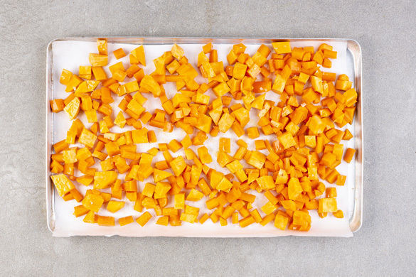 Den Backofen auf 220°C Umluft (240°C Ober-/Unterhitze) vorheizen. Die Süßkartoffel und die Karotten schälen und in ca. 1cm große Würfel schneiden. Mit 1–2EL Pflanzenöl sowie Salz vermengen, auf einem mit Backpapier ausgelegten Backblech verteilen und 10–15Min. im Ofen rösten, bis das Gemüse knusprig ist.