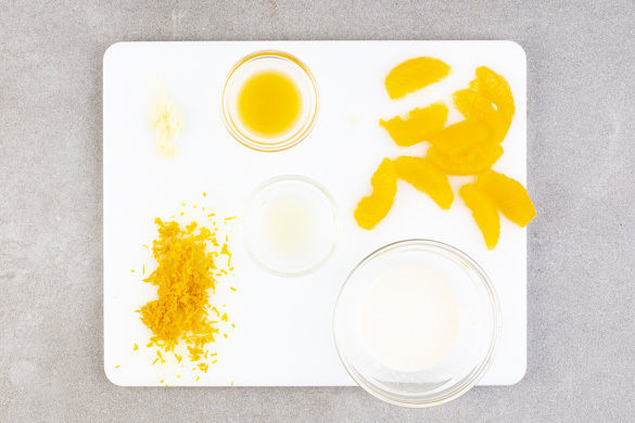 Die Orangenschale abreiben, dann die Orange filetieren, dabei den Saft auffangen. Die Limette halbieren und auspressen. Die Mayonnaise mit 2–3TL Orangensaft und 1TL Limettensaft verrühren. Den Knoblauch schälen und fein würfen oder reiben.