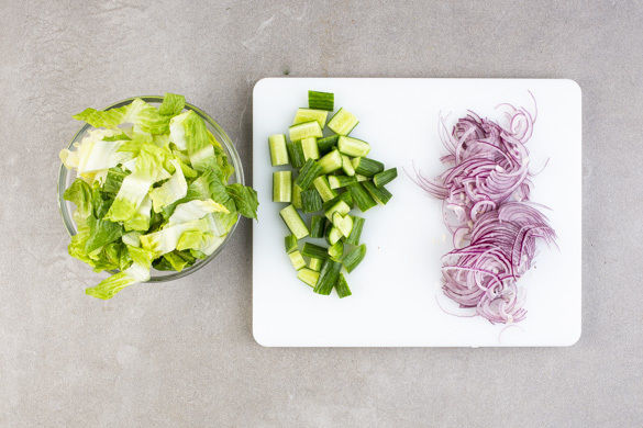Den Romanasalat längs halbieren und in ca. 1cm breite Streifen schneiden. Die Gurke längs halbieren, die Hälften jeweils längs vierteln und die Streifen in ca. 2cm lange Stücke schneiden. Die Zwiebel schälen, halbieren und in feine Streifen schneiden.