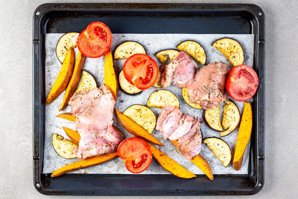 Das vegane Hähnchen und die Tomaten nach ca. 25Min. Garzeit zu dem Gemüse auf die Backbleche geben und im Ofen 7–10Min. backen, bis alles gar und appetitlich gebräunt ist.