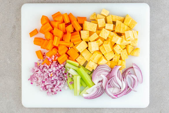 Die Speiserübe schälen und in 1–2cm große Stücke schneiden. Die Karotten ggf. schälen und ebenfalls in 1–2cm große Stücke schneiden. Den Sellerie breite Streifen schneiden. Die Zwiebeln schälen und halbieren, eine Hälfte in ca. 1cm dicke Spalten schneiden, die andere Hälfte fein würfeln.