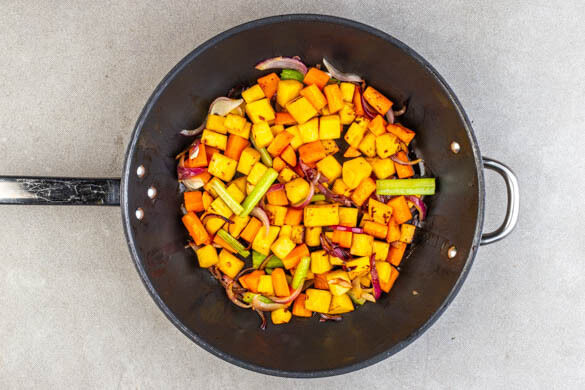 Die Speiserüben, die Karotten, den Sellerie und die Zwiebelspalten in einer großen Pfanne mit 2EL Olivenöl bei mittlerer Hitze 12–15Min. braten. Zwischendurch mit 2–3EL Wasser ablöschen und verdampfen lassen, bis das Gemüse deutliche Röstspuren hat und bissfest gegart ist. Mit Salz und Pfeffer abschmecken.