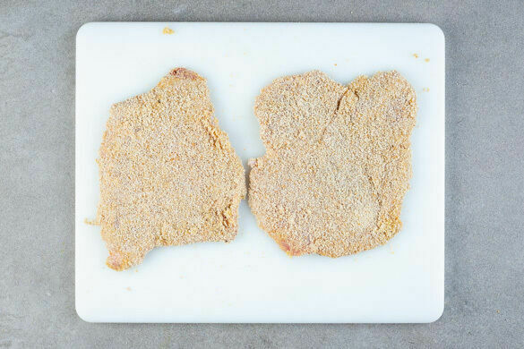 Auf einem tiefen Teller 100g Mehl mit 1 Prise Pfeffer verrühren. Auf einem zweiten Teller 1 Ei mit der Gewürzmischung verquirlen. Auf einem dritten Teller die Semmelbrösel bereitstellen. Das Fleisch nacheinander im Mehl, dem verquirlten Ei und den Semmelbröseln wenden.