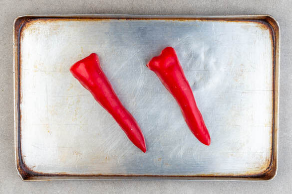 Den Backofen auf 240°C (220°C Umluft) vorheizen. Die Paprika halbieren, entkernen und mit der Schnittfläche nach unten auf ein Backblech legen, dabei kein Backpapier verwenden. Die Paprika in der unteren Ofenhälfte rösten, bis sie in Schritt 2 herausgenommen werden.