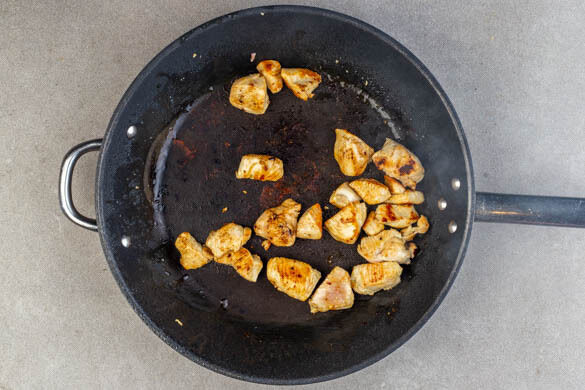 Das Fleisch trocken tupfen und in ca. 2cm breite Würfel schneiden. Das Fleisch mit 1EL Pflanzenöl und 1 kräftigen Prise Salz in einem Wok oder einer großen Pfanne bei starker Hitze in 3–4Min. rundum goldbraun braten. Es soll noch nicht vollständig durchgaren. Anschließend herausnehmen und abgedeckt beiseitestellen.