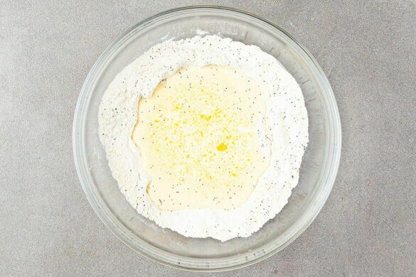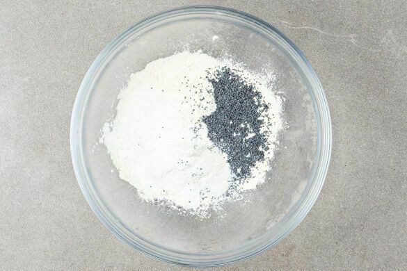 In einem zweiten kleinen Topf oder in der Mikrowelle 40g Butter schmelzen. Das Mehl mit dem Mohn, dem Backpulver, dem Vanillezucker, 2EL Zucker und ½TL Salz vermengen.