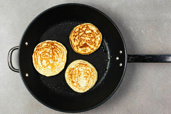 In 2 großen Pfannen jeweils 1EL Pflanzenöl bei mittlerer Hitze erwärmen. 2–3EL Teig portionsweise für jeden Pancake in die Pfannen geben und auf diese Weise je nach Größe der Pfannen mehrere Pancakes gleichzeitig backen. Die Pancakes ca. 2Min. garen, dann wenden und weitere ca. 2Min. backen. Die Hitze ggf. reduzieren. Auf diese Weise 24–28 Pancakes zubereiten.