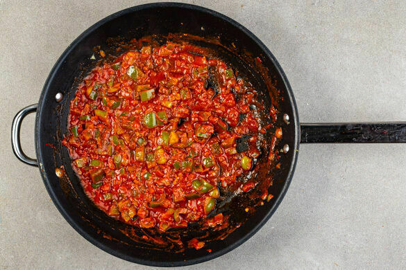 Das Tomatenmark und 150ml Wasser dazugeben, mit dem Gemüse vermengen und bei mittlerer bis starker Hitze aufkochen. Anschließend bei mittlerer Hitze 4–5Min. köcheln lassen, bis das Gemüse weich und die Flüssigkeit größtenteils verdampft ist.