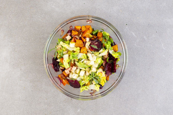 Den Backofen auf 240°C (220°C Umluft) vorheizen. Den Kürbis halbieren, entkernen und in 1–2cm kleine Würfel schneiden. Die Rote Bete schälen und in ca. 1cm breite Spalten schneiden. Tipp: Am besten Küchenhandschuhe und Schürze tragen, da die Rote Bete stark färbt. Die Zwiebel schälen, halbieren und in feine Streifen schneiden.
