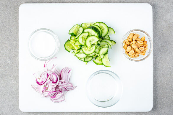 Inzwischen die Gurke längs halbieren und quer in dünne Scheiben schneiden. Die übrige Zwiebel halbieren, in feine Streifen schneiden und mit den Gurken, 4EL hellem Essig, 1EL Zucker und ½TL Salz vermengen. Den Auflauf auf Teller verteilen, mit den Erdnüssen garnieren und mit dem eingelegten Gemüse servieren.