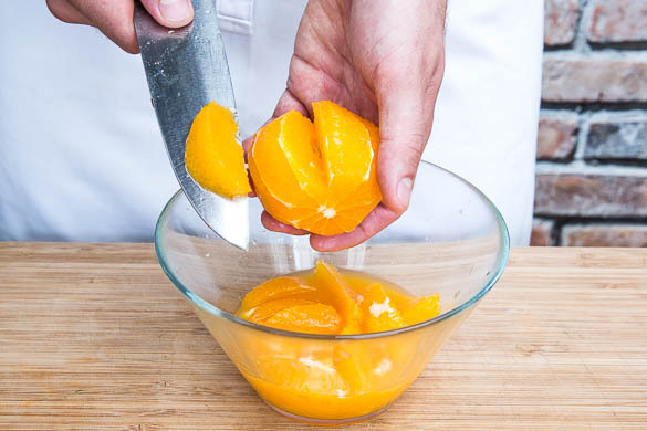 Die Orangen filetieren: Dafür die Orangenschale so herunterschneiden, dass die weiße Haut vollständig vom Fruchtfleisch entfernt wird. Dann die Filets vorsichtig aus den weißen Zwischenräumen schneiden. Aus dem übrigen Gehäuse den restlichen Saft ausdrücken. Tipp: Wer Arbeit sparen möchte, kann auch eine Orange in Spalten schneiden und die zweite Orange auspressen.