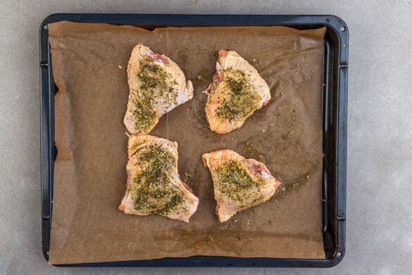Den Backofen auf 240°C (220°C Umluft) vorheizen. Das Fleisch trocken tupfen und mit der Hautseite nach oben auf zwei mit Backpapier ausgelegte Backbleche legen. Mit 4EL Olivenöl beträufeln und mit der Knoblauch-Kräuter-Gewürzmischung und je ½TL Salz und Pfeffer bestreuen. Das Fleisch wenden und mit der Hautseite nach unten ca. 15Min. im Ofen backen.