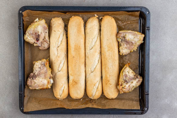 Das Fleisch wenden. Die Brötchen mit der Schnittfläche durch das ausgetretene Fett ziehen und mit der Schnittseite nach oben auf die Bleche legen. Ggf. die Bleche tauschen. Das Fleisch mit den Brötchen 4–5Min. backen, bis die Brötchen knusprig sind. Die Brötchen herausnehmen und das Fleisch weitere ca. 10Min. backen, bis es appetitlich gebräunt und durchgegart ist.
