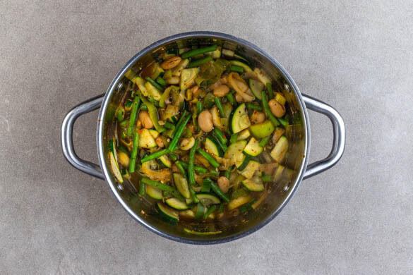 Den Knoblauch und den Lauch in einem großen Topf mit 4EL Olivenöl und der italienischen Gewürzmischung bei mittlerer Hitze 2–4Min. anbraten. 600–800ml Wasser angießen, das Brühgewürz einrühren und die weißen und die grünen Bohnen zugeben. Zum Kochen bringen und abgedeckt ca. 5Min. köcheln lassen. Die Zucchini zugeben und den Eintopf ca. 5Min. weiterköcheln.