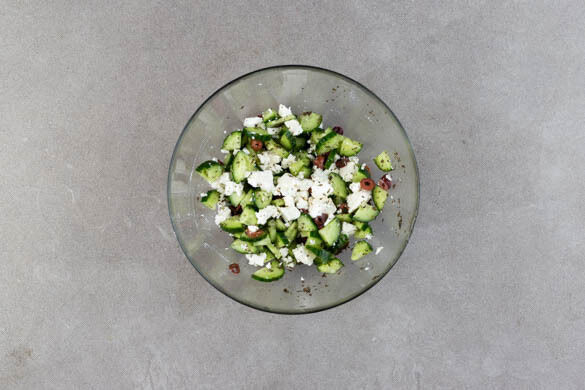 Die ½ der Minze mit 1EL Olivenöl, ½EL Essig, 1 kräftigen Prise Zucker und 1 Prise Salz verrühren. Die Gurke längs vierteln, in Scheiben schneiden und mit dem Minzedressing vermengen. Den Feta hineinkrümeln und die Oliven unterheben.
