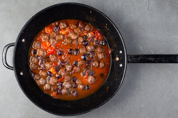 Die Tomaten und ¾ der Weintrauben samt ausgetretenem Saft mit in die Pfanne geben. Die Weintrauben mit einer Gabel etwas zerdrücken, damit mehr Saft austritt. 150ml Brühe dazugeben und ca. 5Min. köcheln lassen, bis die Würste gar ist.