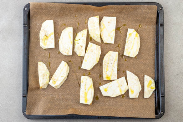 Den Backofen auf 240°C (220°C Umluft) vorheizen. Den Sellerie vierteln und schälen, dann in ca. 1,5cm breite Scheiben schneiden. Auf zwei mit Backpapier ausgelegte Bleche verteilen und den Sellerie auf jedem Blech mit 1½EL Olivenöl einreiben und mit Salz und Pfeffer würzen. Im Ofen 22–25Min. Ofen backen, dabei den Sellerie nach der Hälfte der Backzeit wenden und die Bleche tauschen.