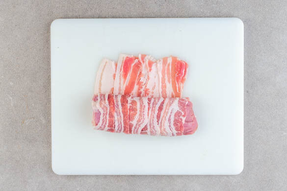 Die Baconscheiben leicht überlappend auslegen. Das Fleisch trocken tupfen, quer auf den Bacon legen und einrollen. In je 4 gleich dicke Scheiben schneiden.