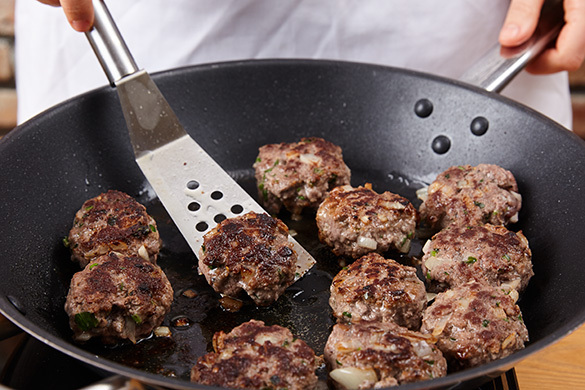 Die Bouletten in einer großen Pfanne mit 2EL Pflanzenöl bei mittlerer Hitze auf jeder Seite 5–7Min. braten, bis das Fleisch durch ist. Dann aus der Pfanne nehmen und auf einem Teller abgedeckt warm halten.