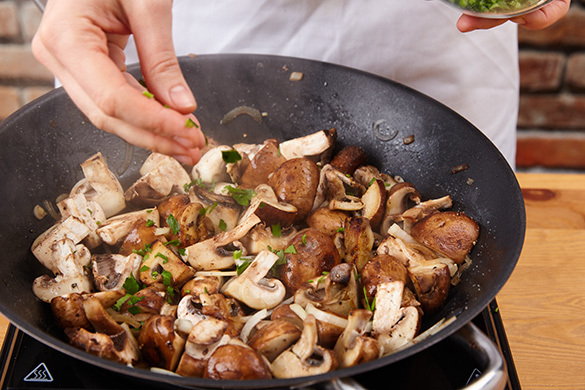 Die Pilze in derselben Pfanne mit 2EL Pflanzenöl bei starker Hitze 3–4Min. scharf anbraten. Die Zwiebelstreifen dazugeben und 1–2Min. mitbraten. Mit je 1 kräftigen Prise Salz und Pfeffer würzen und die restliche Petersilie untermischen.