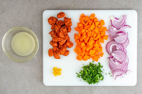 Inzwischen die vegane Chorizo in ca. 1cm große Würfel schneiden. Die Karotte ggf. schälen, längs vierteln und in dünne Scheiben schneiden. Die Zwiebel schälen, halbieren und in feine Streifen schneiden. Die Zitronenschale abreiben, dann die Zitrone halbieren und auspressen. Die Petersilie fein hacken.