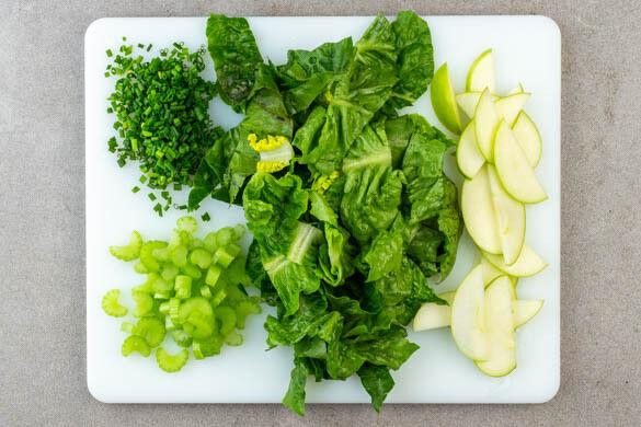 Den Sellerie in dünne Scheiben schneiden. Den Salat vom Strunk befreien und quer in ca. 2cm breite Streifen schneiden. Den Schnittlauch in kleine Röllchen schneiden. Die Äpfel, den Sellerie und den Salat mit dem Dressing vermengen. Den Salat mit den Eiern belegen und mit den Walnüssen, den Croûtons und dem Schnittlauch bestreut servieren.
