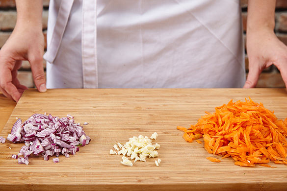 Ofen auf 200°C Ober- und Unterhitze vorheizen. Die Karotten schälen und mit der Küchenreibe grob raspeln. Die Zwiebel und den Knoblauch schälen und in feine Würfel schneiden.