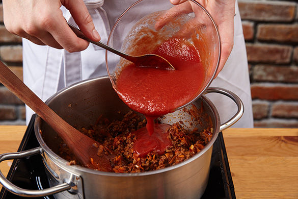 Das Tomatenmark mit zu dem Fleisch geben und für weitere 1-2Min. mitrösten, alles mit den passierten Tomaten ablöschen und für ca. 10Min. bei mittlerer Hitze köcheln lassen. Die Konsistenz der Sauce sollte cremig/dickflüssig sein. Mit 1TL Zucker, Salz und Pfeffer abschmecken.