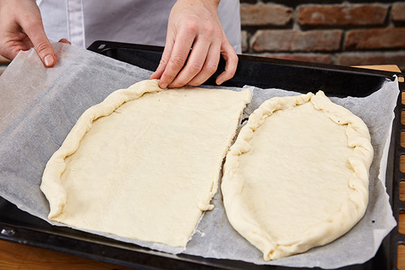 Inzwischen den Pizzateig mit dem Backpapier auf ein Backblech legen und mittig halbieren. Nun je eine Hälfte Teig an den Rändern ca. 2-3cm zu einem Schiffchen aufrollen. Kochtipp an der linken Seite beachten.