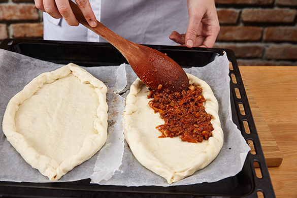 Nun die Sauce auf die Pide gleichmäßig verteilen, aber keine Füllung auf den Rand geben. Die Pide im Ofen für ca. 20Min. goldbraun backen.