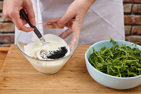 Inzwischen den Joghurt mit dem Schwarzkümmel sowie Salz und Pfeffer abschmecken. Den Salat mit 1EL Öl und 1TL Essig sowie Salz und Zucker marinieren. Pide mit Joghurt beträufeln und mit dem Rucola-Salat servieren. Je nach Geschmack etwas Salat ebenfalls über die Pide geben.