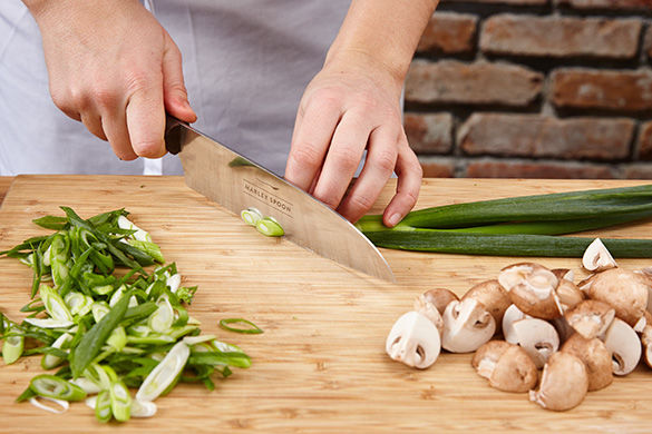 Die Pilze von evtl. Schmutz befreien und vierteln. Enden der Lauchzwiebeln entfernen und den Rest schräg in ca. 1cm dünne Ringe schneiden.
