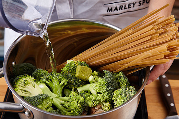 Brokkoli, Pilze, 1TL Zitronenabrieb, 1/2 des Gemüsebrühwürfels und die Pasta in einen großen Topf geben. Mit 500ml Wasser auffüllen. Den Topf nun bei hoher Hitze erwärmen, bis das Wasser kocht. Dann die Hitze reduzieren und unter ständigem Rühren die Pasta 9-11Min. gar kochen. Evtl. noch etwas Wasser zugießen bis die Pasta bissfest ist.