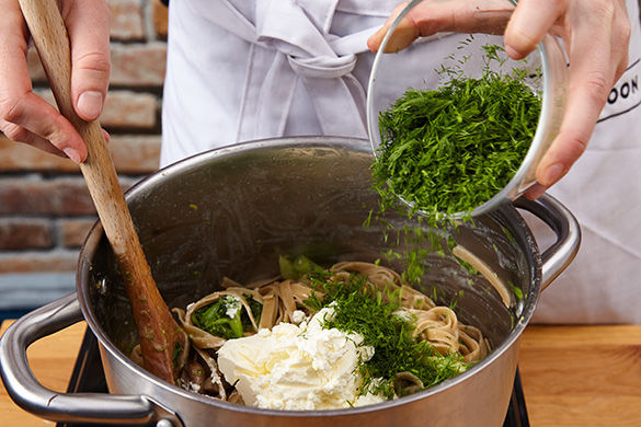 Sobald die Pasta gar ist, den Topf vom Herd nehmen, die Lauchzwiebeln dazugeben und die Pasta weitere 2Min. ziehen lassen. Mit Salz und Pfeffer abschmecken.