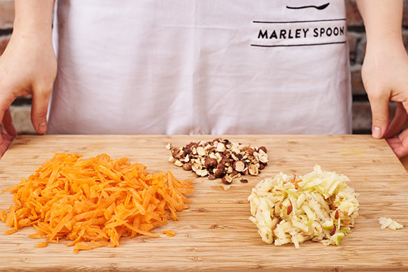 Währenddessen die Karotten schälen und mit einer Küchenreibe grob raspeln. Den Apfel vierteln, entkernen und ebenfalls grob raspeln. Die Haselnüsse grob hacken und in einer kleine Pfanne bei mittlerer Hitze ohne Zugabe von Fett goldbraun anrösten. Vorsicht, die Nüsse können schnell verbrennen. Zum Abkühlen aus der Pfanne nehmen, damit sie nicht nachdunkeln.