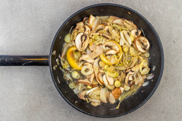 4EL Butter in einer großen Pfanne schmelzen, dann die Schalotten, den Lauch, die Pilze und die Zitronenscheiben zugeben und unter gelegentlichem Rühren 4–6Min. braten, bis das Gemüse weich ist und die Zitrone zu karamellisieren beginnt. Das Brühgewürz und 200ml Wasser unterrühren und 3–5Min. köcheln lassen, bis die Brühe__ um die Hälfte reduziert ist.