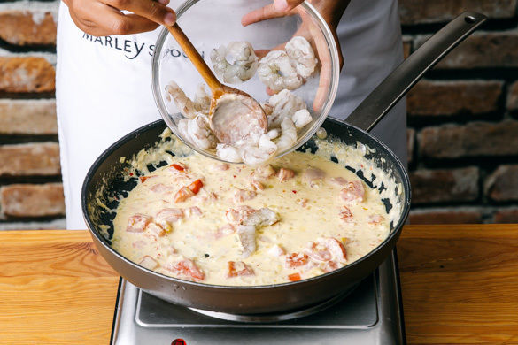 Die Garnelen in die Sauce geben und 3–4Min. mitköcheln, bis sie rosa und gar sind.