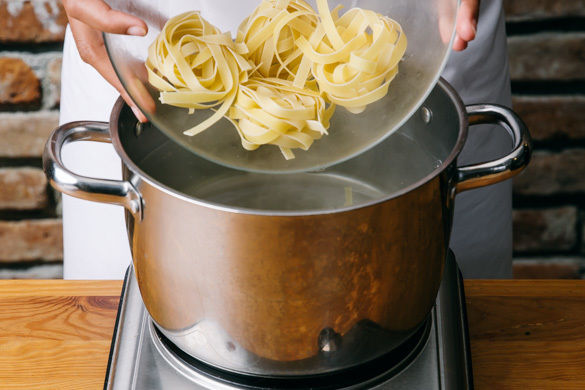Die Pasta in das kochende Wasser geben und in 7–9Min. bissfest kochen. Mit einer Tasse etwas Pastawasser abschöpfen, dann die Pasta in ein Sieb abgießen und abtropfen lassen. Zurück in den Topf geben und 1TL Olivenöl unterrühren.