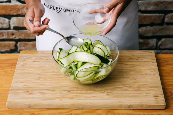 Die Zucchini mit einem Sparschäler in lange Streifen schneiden, den weichen Kern aussparen. Die Zucchinischeiben mit 1–2TL Olivenöl, 1EL Zitronensaft sowie Salz und Pfeffer würzen.