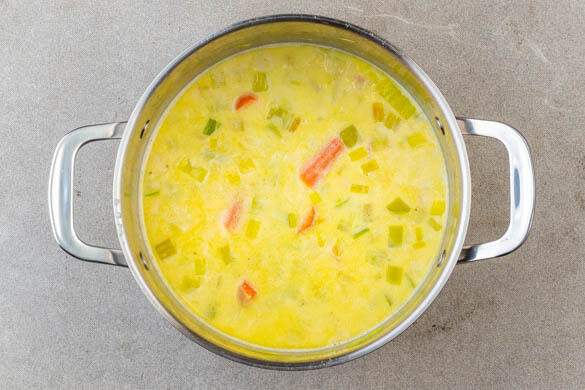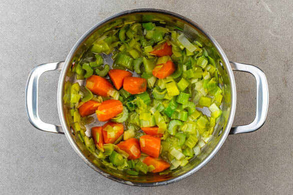 Den Lauch längs halbieren und quer in feine Streifen schneiden. Die Karotten ggf. schälen und in ca. 2cm große Stücke schneiden. Den Stangensellerie in ca. 1cm breite Streifen schneiden. 2EL Butter in einem zweiten großen Topf bei mittlerer Hitze schmelzen, dann das Gemüse mit 1 kräftigen Prise Salz hinzugeben und 5–7Min. garen, bis der Lauch weich ist.